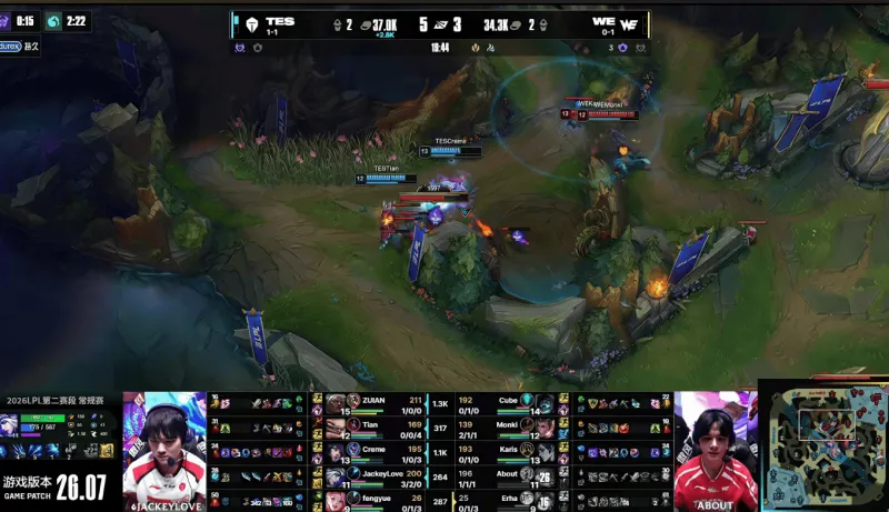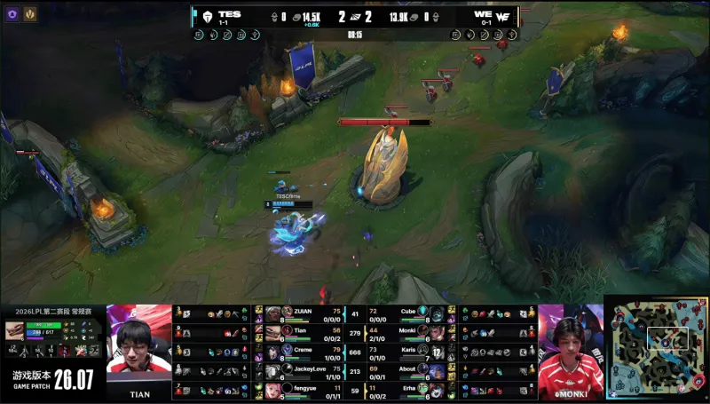 20分钟;WE强开JKL无果后,TES就地反打打出0换3顺势拿下大龙