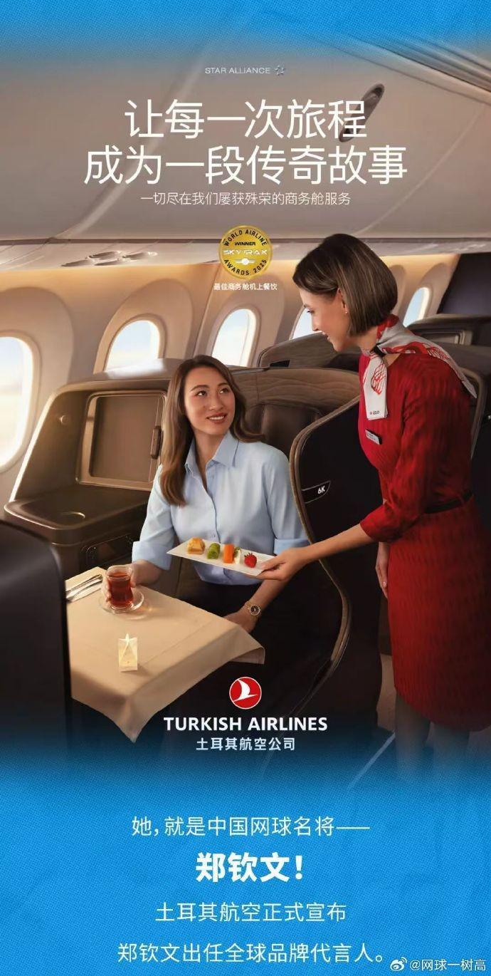 2月6日,土耳其航空官宣中国选手郑钦文成为全球品牌代言人。