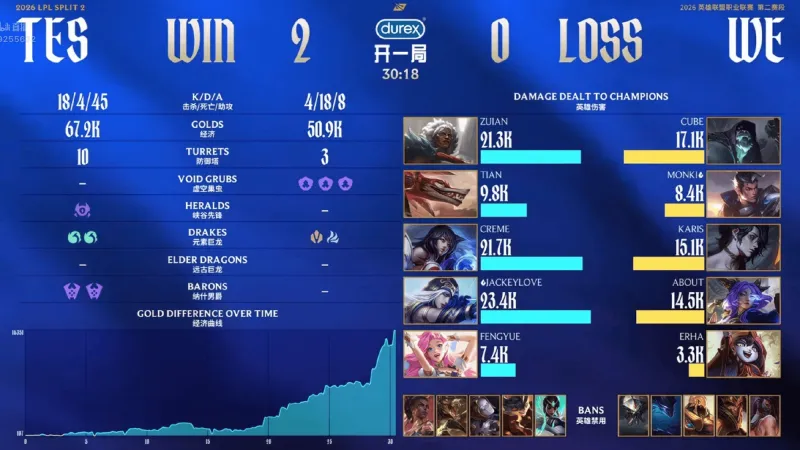 20分钟;WE强开JKL无果后,TES就地反打打出0换3顺势拿下大龙